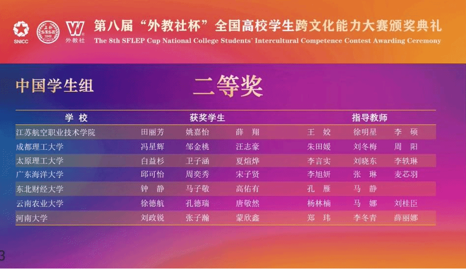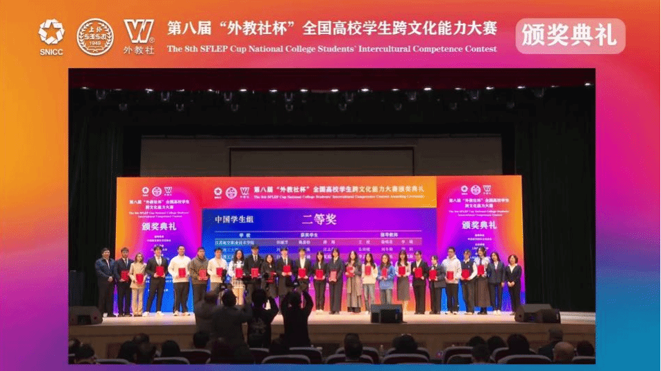 12月14日,第八届“外教社杯”全国高校学生跨文化能力大赛全国总决赛在上海外国语大学落下帷幕。由我校白益杉、卫子涵、夏煊烨三位同学组成的参赛团队,在李言实、刘晓东、李轶琳老师的精心指导下,凭借扎实的功底、出色的发挥与默契的配合,最终荣获全国二等奖,为山西省和我校赢得了荣誉。这一成绩不仅是我校在本项赛事中的历史性突破,也充分展现了我校学子的卓越风采与跨文化培养的丰硕成果。