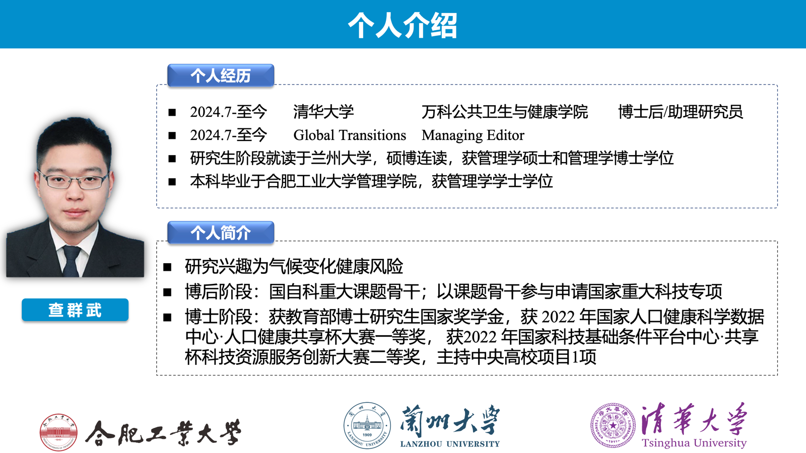 2026年2月1日晚8时,一场聚焦“气候变化与健康治理”前沿议题的云端学术交流会圆满落幕。应公管系教师王斌邀请,清华大学万科公共卫生与健康学院博士后查群武通过腾讯会议,为公管系本科生带来了题为《气候变化下的环境健康风险研究》的专题讲座。活动由公管系教师王斌主持,山西省卫健委发展与研究中心郝东亮主任及公管系教师杨光耀受邀出席,李上殊、刘钰莹、唐浩铨等十余名本科生参加。