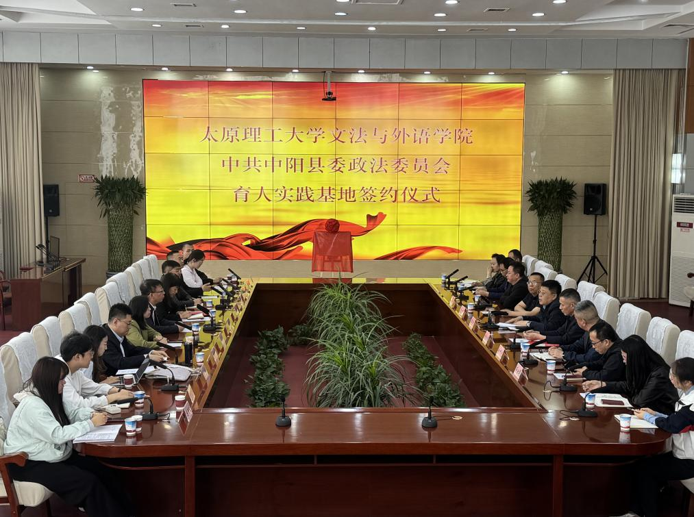 在中阳县委主楼一楼东会议室,双方举行了中阳县委政法委与太原理工大学文法与外语学院育人实践基地签约仪式。仪式现场,氛围庄重而热烈。中阳县委常委、政法委书记王恒主持仪式,学院副院长杨建华与中阳县委政法委主持日常工作的副书记王成明代表双方郑重签订育人实践基地共建协议,明确了双方合作的目标任务、主要内容和保障机制,为后续校地协同育人奠定了坚实基础。